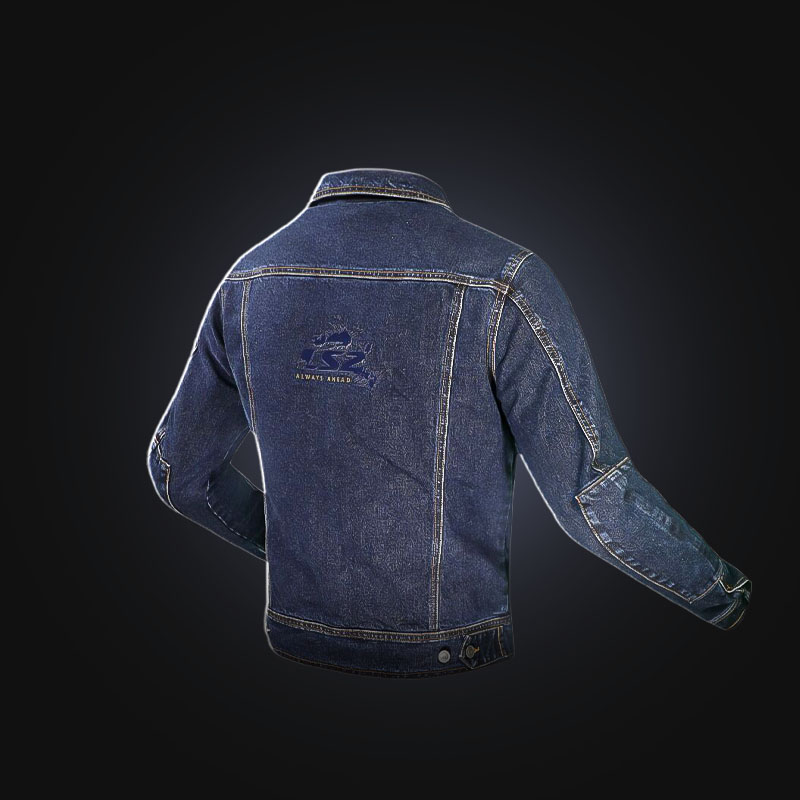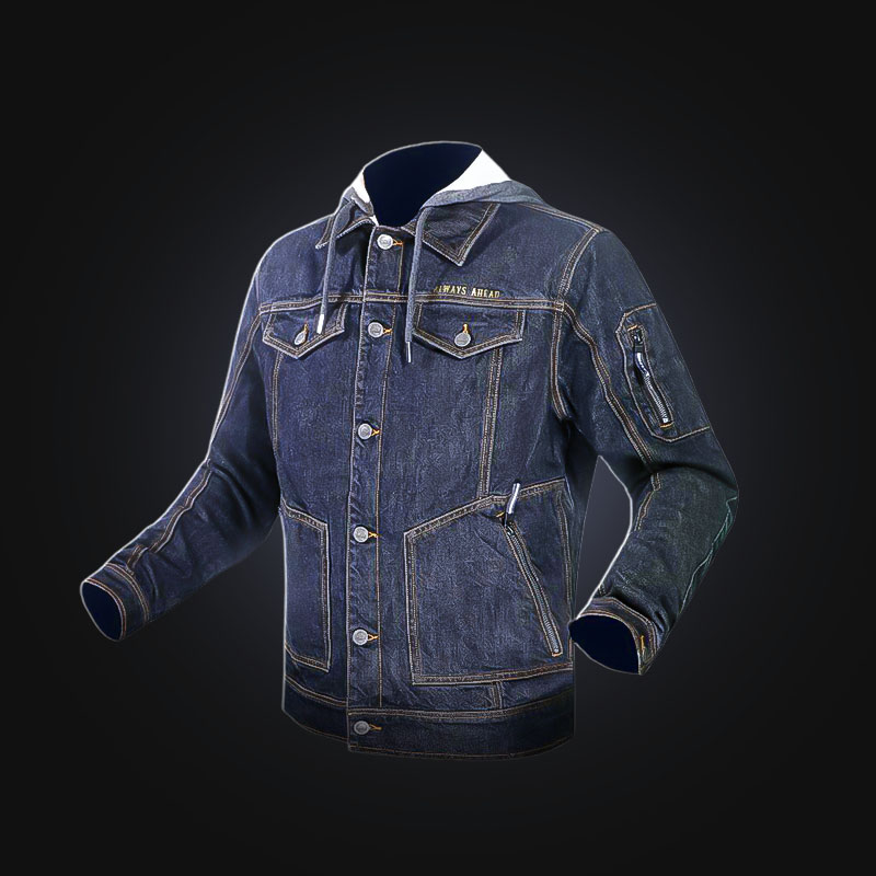 سترة من الدنيم الحضري مع غطاء رأس قطني قابل للفصل. إغلاق مزدوج، بسحاب وأزرار، للتهوية والملاءمة الآمنة. حماة قابلة للإزالة على المرفقين والكتفين.